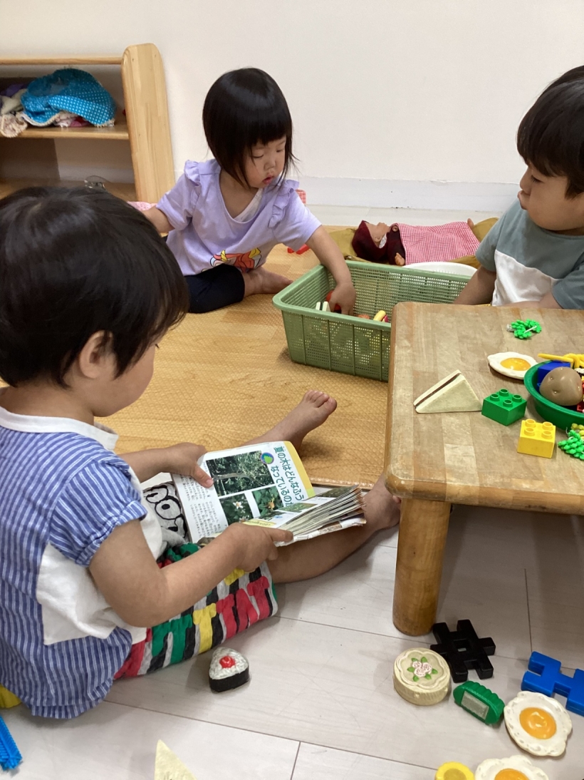 お部屋での様子です。絵本は1人でじっくりと読んだり、お友達とと半分こしながら読んでいます。