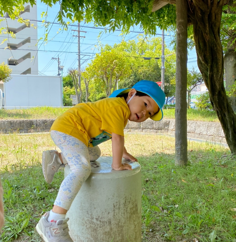 うさぎ組になって初めてのお散歩で、るんるんのうさぎ組さん。滑り台や動物の形の遊具に乗って遊んだり、草や木を集めていたり、自分たちの好きな遊びを楽しみました。滑り台は大人気で何度も滑りたい子が多かったのですが、順番に並んで楽しむことが出来ました!