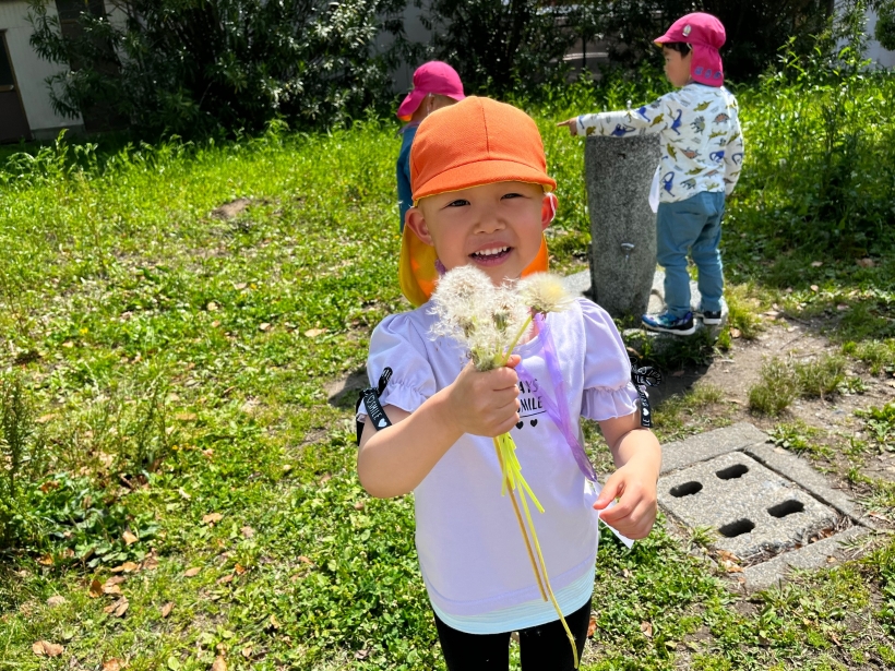 オオバコを見つけてひっぱり相撲をしたり、たんぽぽの茎を割いて水につけて、くるくるになる様子を、不思議そうに見たり、友達とどれぐらいくるくるになったか見せ合って楽しんでいました。