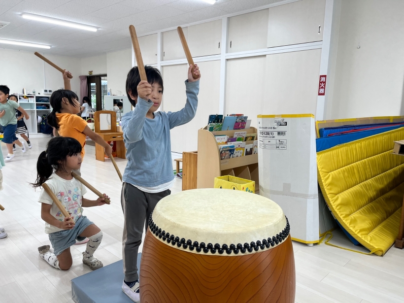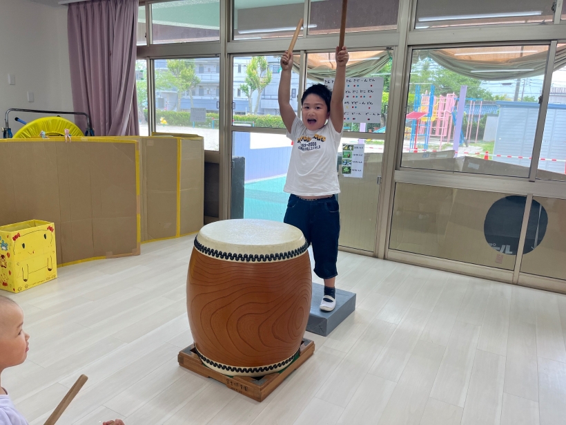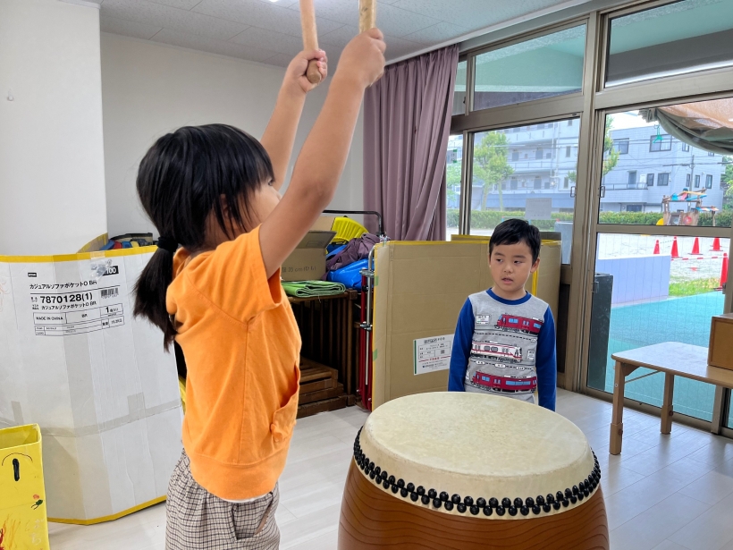 友だちの叩く姿を褒めたり、友だちと一緒に叩くことを楽しんでいます。