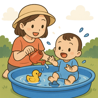 当日は、水あそびをします。おもちゃで遊んだり、水に触れて、水の感触を楽しもう!