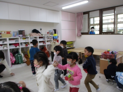 年長組さんが鬼になって各クラスを回っていくと、みんな大喜びで