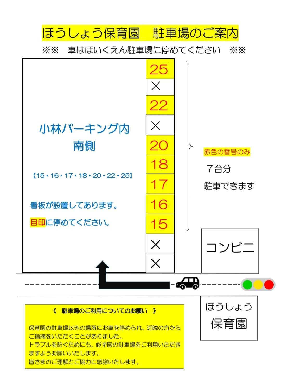 交通アクセス 駐車場あります 保育園北側 小林パーキング内の以下の番号(7台分) 【15・16・17・18・20・22・25】 セブンイレブンより北側にあります。 ※セブンイレブンには停めないでください。
