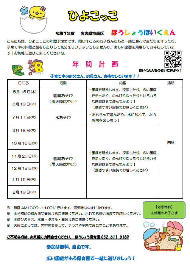 令和7年度【ひよこっこ】年間予定 未就園児を対象に子育て支援を行っています。 同じ年ごろのお子さんたちと一緒に遊んで友だちをつくったり、子育て仲間と話をして気分をリフレッシュしてみませんか。楽しい企画を用意して、お待ちしています!お気軽にご参加ください。